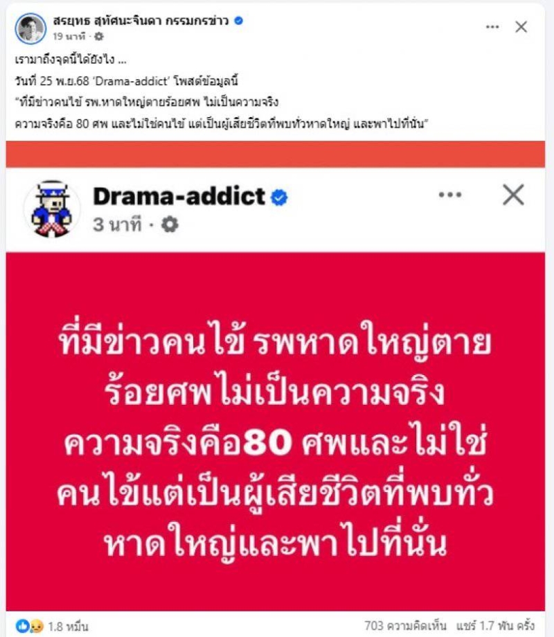 เรื่องของเรื่องคือ ก่อนหน้านี้มีข่าวลือว่อนเน็ตว่า รพ.หาดใหญ่ มีคนไข้เสียชีวิตรวดเดียว 100 ศพ! เล่นเอาชาวเน็ตแตกตื่นกันยกใหญ่ แต่ล่าสุด Drama-addict ออกมาเบรกหัวทิ่ม เผยความจริงที่พีคกว่าเดิมว่า… ไม่ใช่ 100 ศพ แต่เป็น 80 ศพ! และที่สำคัญคือ ไม่ใช่คนไข้ที่ตายในโรงพยาบาลทั้งหมด แต่เป็นร่างผู้เสียชีวิตที่พบทั่วเมืองหาดใหญ่ แล้วเจ้าหน้าที่กู้ภัยลำเลียงมารวมกันไว้ที่นี่ต่างหาก